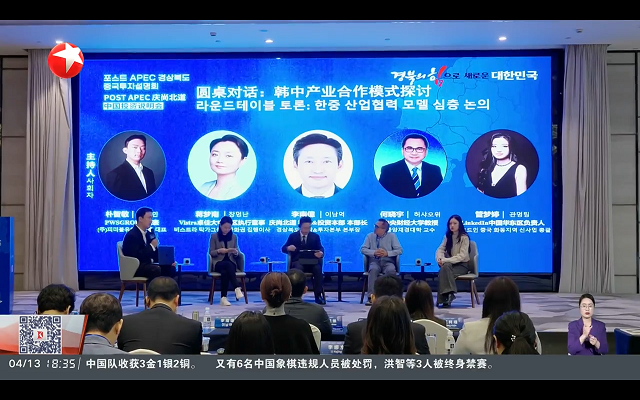 近日,由韩国最大行政区庆尚北道主办的“POST APEC庆尚北道中国投资说明会”隆重举行。中韩政商界代表齐聚,韩国国家级核心产业资源现场对接。东方卫视对此进行报道,并指出,中韩经贸正迈入高质量发展新阶段。