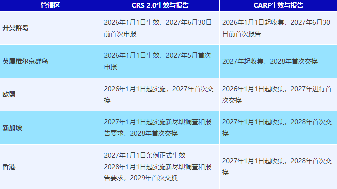 从全球实施节奏来看,CRS 2.0已于2026年1月1日正式生效,首次信息交换将于2027年进行(对应2026报告年度)。CARF方面,截至 2025 年底,已有 76 个国家和地区承诺实施CARF,并将分批推进制度落地。